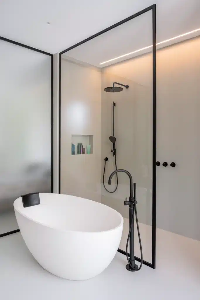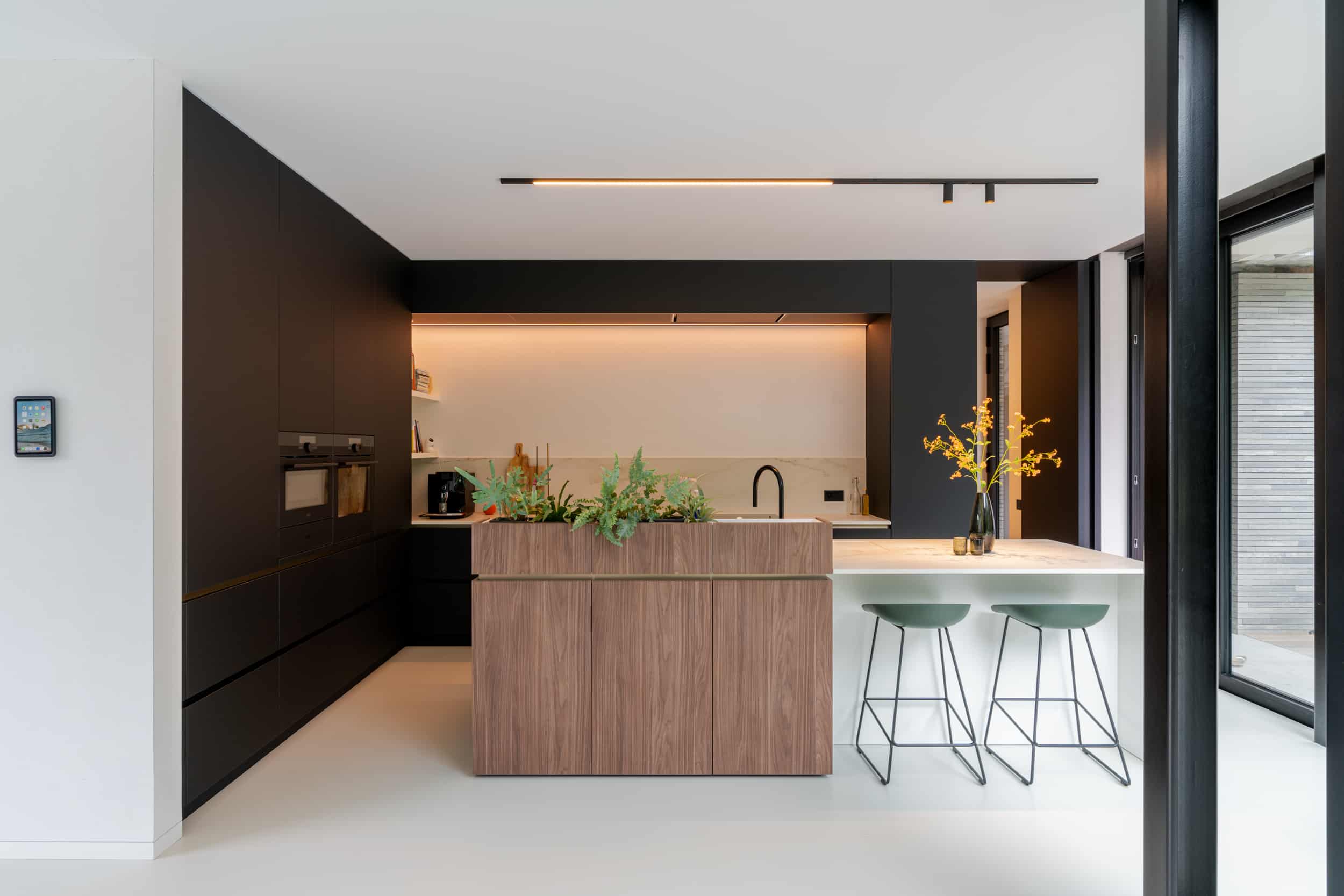 Volledig in lijn met de architectuur, werkte Hus een interieurconcept uit waar warme materialen en frisse kleuren elkaar afwisselen. De witte vloeren en plafonds zorgen voor een optimale benutting van het daglicht, terwijl de zwarte accenten een stijlvol contrast brengen. Doorheen de hele woning zorgen de warme toetsen van notelaar voor balans tussen beide. De kleinere wensen van de bewoners, zoals de ingewerkte plantenbak in het keukeneiland, of een subtiele kabeldoorvoer in het tv-meubel, werken het geheel tot in de puntjes af.
