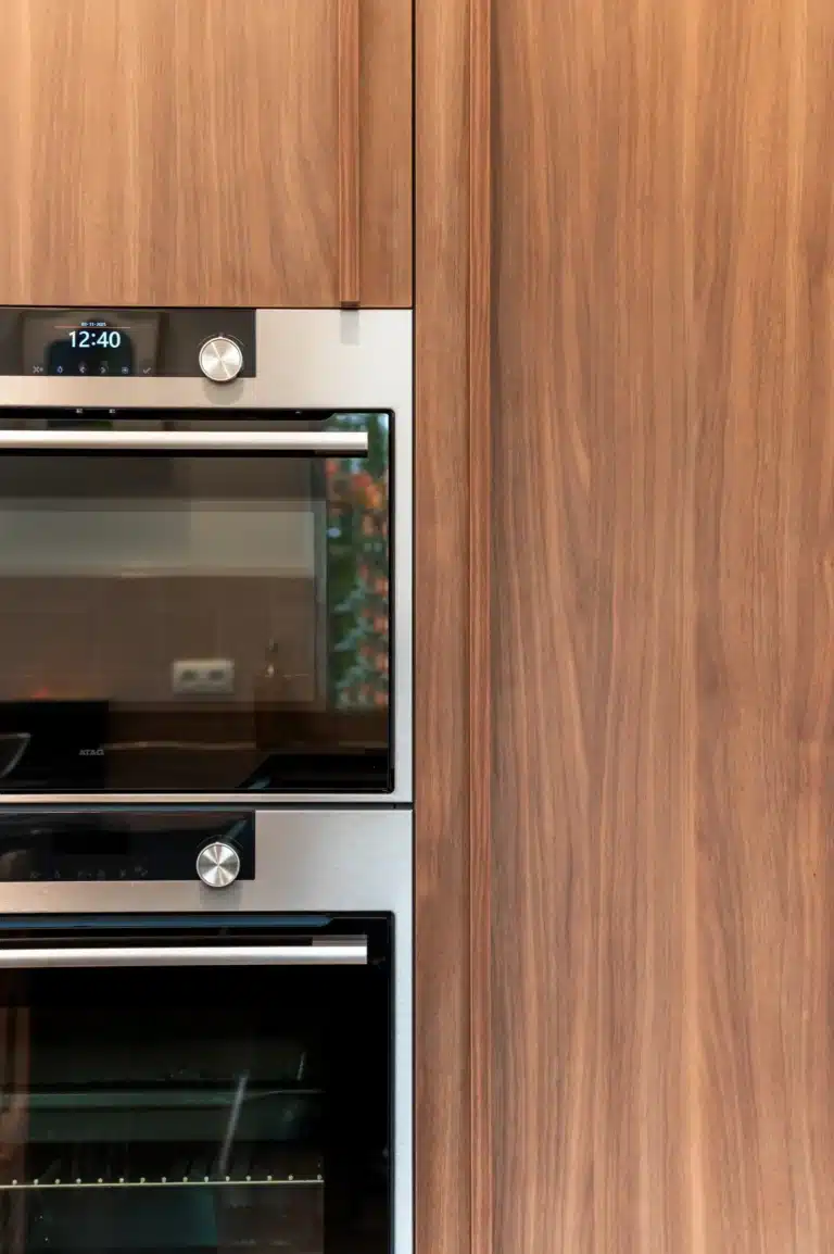 De keuken werd opgebouwd rond een ruim eiland dat uitnodigt tot samenkomen. De steengroene fronten brengen een zachte diepte in het interieur en worden verfijnd gecombineerd met warm walnootfineer. Als verbindend element kozen we voor een gepolijst natuurstenen werkblad in Verde Rajasthan. Een materiaal dat tegelijk kracht en elegantie toevoegt, en de keuken een duidelijke identiteit geeft. Ook in de opstelling zit diezelfde rust. De toestellen zijn strak ingebouwd waardoor het frontbeeld kalm blijft. De geïntegreerde spoelzone in het eiland maakt het geheel praktisch, zonder visueel te overheersen.