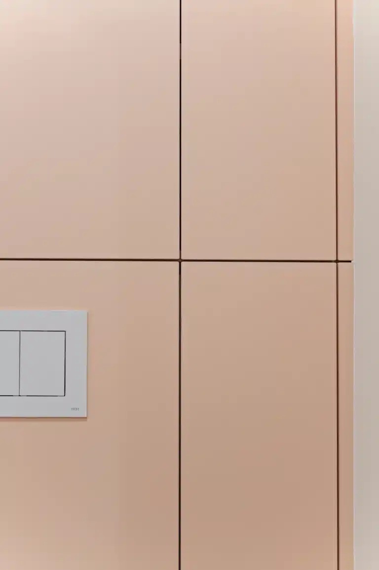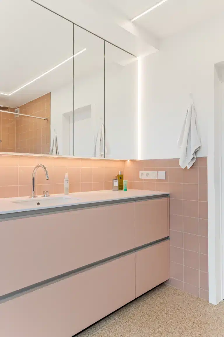 De badkamer en het toilet sluiten naadloos aan bij het keukenconcept. Pastelroze wandtegels zorgen voor een speelse maar ingetogen toets, als knipoog naar het mid-century karakter. In de badkamer komt daar een maatwerk meubel in zacht poederroze bij, gecombineerd met een wit werkblad in compact laminaat. Spiegelkasten met geïntegreerde verlichting zorgen voor een helder maar warm lichtbeeld.